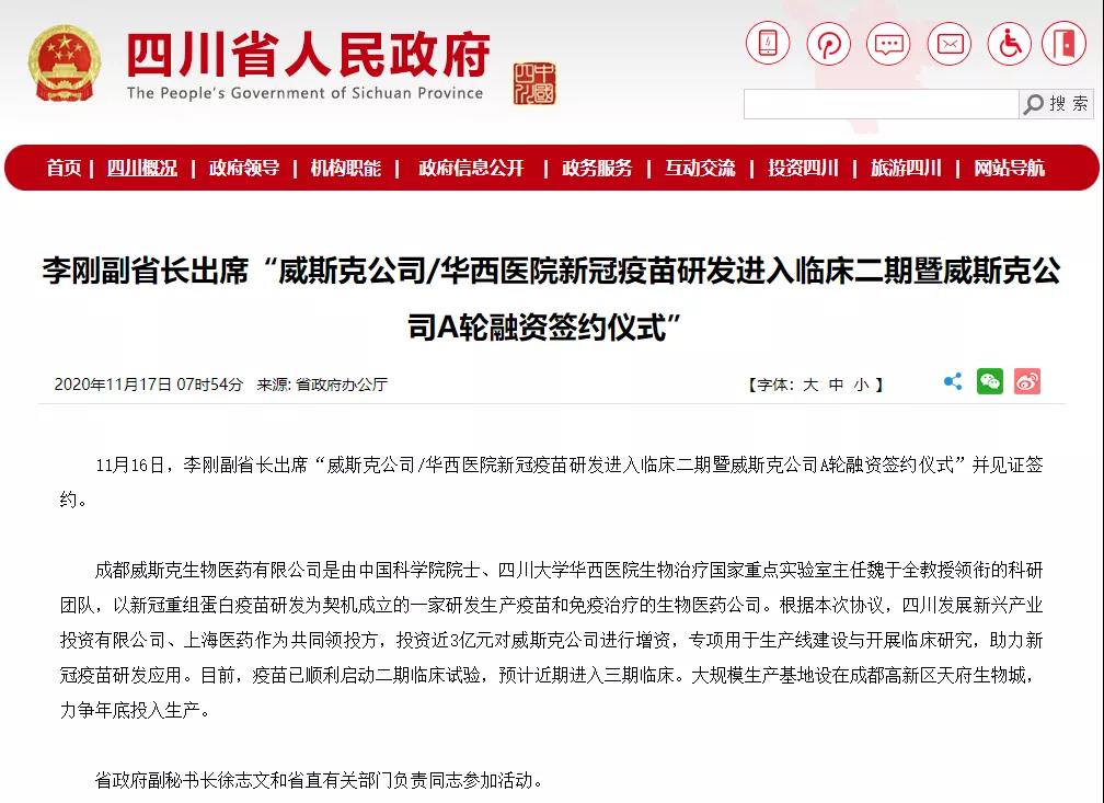 2020年2月,四川大学华西医院生物治疗国家重点实验室研发的新冠病毒重组蛋白疫苗开展动物实验。3月10日,尹力省长到我校调研指导疫情防控科研攻关工作。7月29日,四川大学新冠病毒重组蛋白疫苗相关研究成果在Nature 在线发表,这是Nature杂志发表的第一篇新冠疫苗研究论文。8月21日,该重组蛋白新冠疫苗获国家药监局临床试验批文。