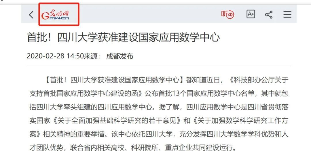 2020年2月28日,据光明网报道,《科技部办公厅关于支持首批国家应用数学中心建设的函》公布首批13个国家应用数学中心名单,包括我校牵头组建的四川应用数学中心。
