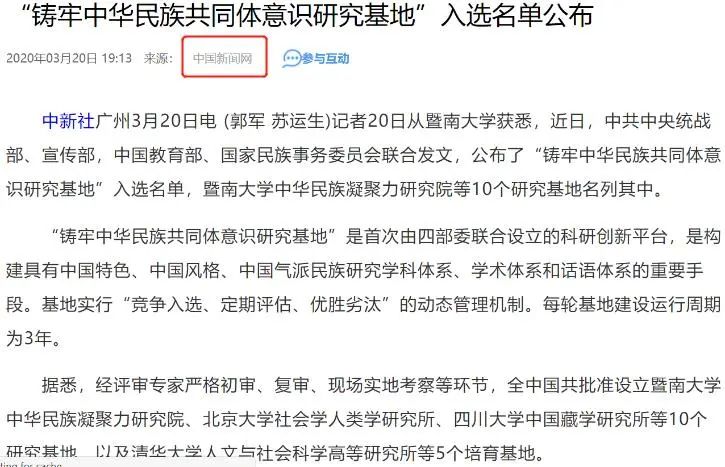 2020年3月,由中央统战部、中央宣传部、教育部、国家民委四部委联合发文,公布了首批入选国家铸牢中华民族共同体意识研究基地名单,十个单位入选,四川大学名列其中,标志着我校已拥有6个文科类的国家级研究平台。这一平台的设立是对长期以来我校作为西部地区规模最大的综合性大学在藏学、民族史、民族学等研究领域的学术贡献及服务西部民族地区社会经济发展取得显著成绩的一个极大鼓励与肯定。中国新闻网、中国社会科学网等媒体对此进行了报道。