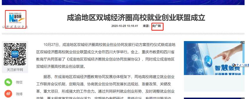2020年5月12日,新华网、央广网等多家媒体报道了由四川大学和重庆大学牵头的成渝地区双城经济圈20所高校联盟成立大会。报道指出,该联盟旨在以创新、协调、绿色、开放、共享的发展理念为指引,以服务成渝地区双城经济圈打造成为具有全国影响力的重要经济中心、科技创新中心、改革开放新高地、高品质生活宜居地为己任,以推动实现成渝地区高等教育内涵式发展为目标,推动联盟各高校间开展全方位的友好合作,为推动成渝地区双城经济圈战略目标实现提供人才保障、智力支持和科技支撑。