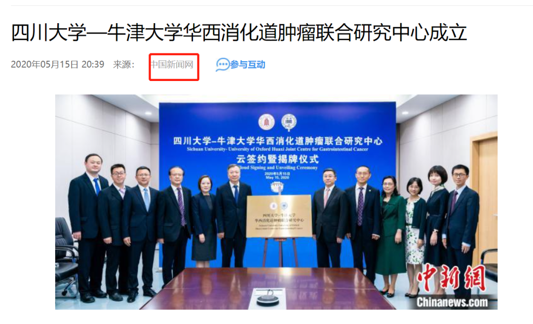 2020年5月15日,据中新网报道,四川大学-牛津大学华西消化道肿瘤联合研究中心云签约暨揭牌仪式在我校华西医院医技楼举行。该中心是牛津大学首次与中国西部高校在医学领域共建的科研合作平台。两校的专家学者和来自全球的同行将在中心平台上进行人才培养、科学研究、疾病诊治等方面的合作,特别是围绕生命健康的重大问题展开研究,对相关疾病进行早期诊断和早期治疗,提供更加科学的治疗方案,提高患者生存率,造福人类生命健康。