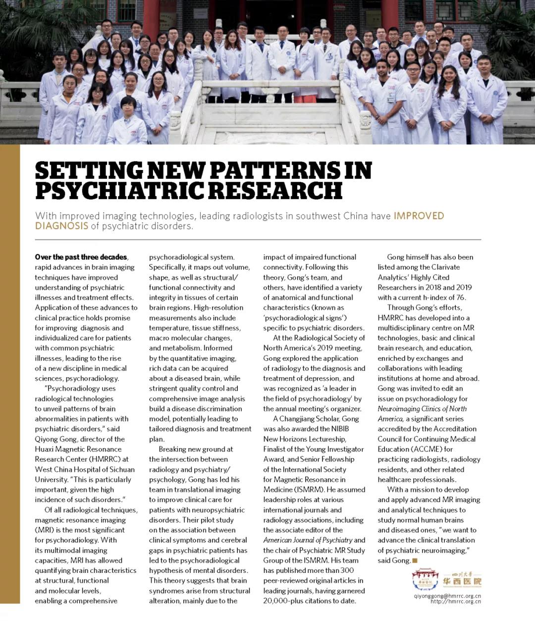 2020年5月,国际期刊Nature的科技亮点Spotlight专栏聚焦快速突进的中国脑科学,展示了中国脑科学研究团队的重要贡献,其中我校华西医院华西磁共振研究中心(HMRRC)研究团队因在脑科学研究领域建立心理与精神疾患临床研究从“0”到“1”的创新模式被同期专栏报道。