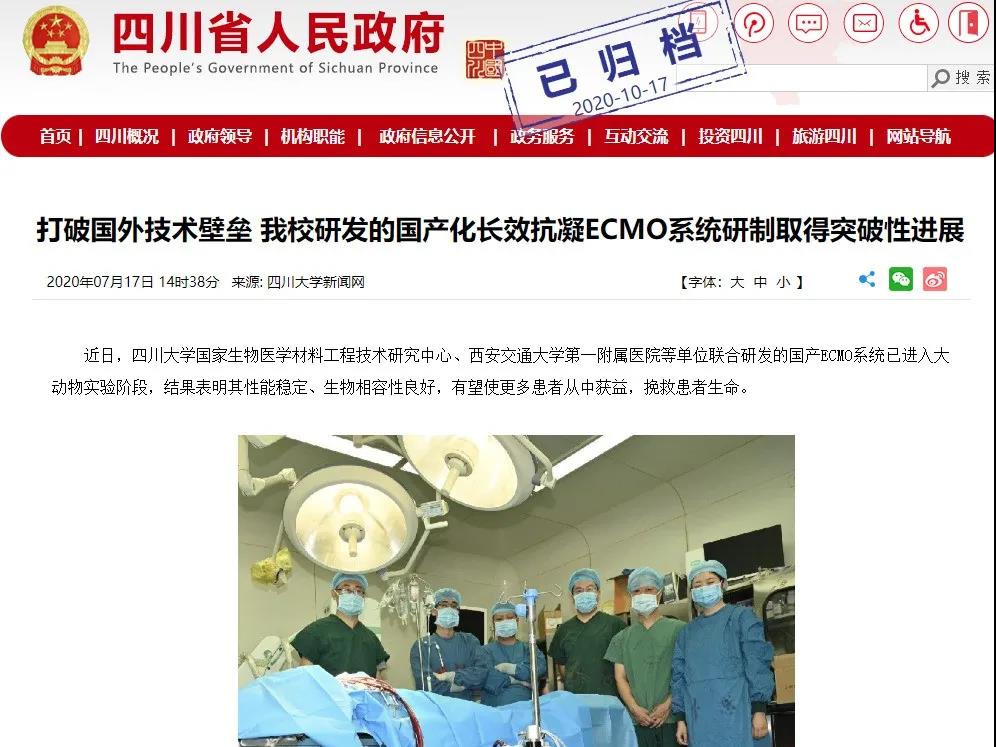 2020年7月,四川大学国家生物医学材料工程技术研究中心等单位联合研发的国产ECMO系统已进入大动物实验阶段,结果表明其性能稳定、生物相容性良好,有望使更多患者从中获益,挽救患者生命。四川大学国家生物医学材料工程技术研究中心近年来在国内开展ECMO系统的相关研发工作,率先开发出国际领先的ECMO系统长效抗凝涂层核心技术,为国产ECMO系统的研发做出了突破性贡献。四川省人民政府网等媒体对该项成果进行了报道。