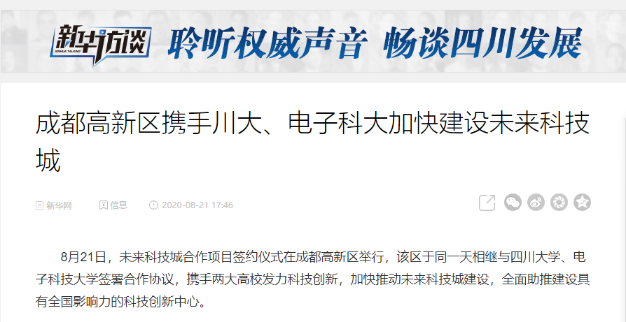 2020年8月21日,新华网等多家媒体刊登我校与成都市高新区携手推动世界一流未来科技城建设的报道。报道指出,双方将共建一批重大科技基础设施和国家级创新平台,共同策划并申报一批国家重大科技计划项目、国家重大创新研发平台,推动一批新型研发机构建设,加强关键技术攻关,推动科技成果转化和应用。特别是,双方将在前期合作的基础上共建生命健康实验室,争创国家实验室。该批项目预计总投资100亿元,项目主要落地未来科技城。同时,双方将共同支持我校高层次人才在成都高新区创新创业。