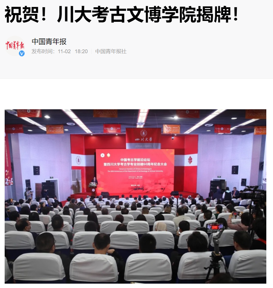 在我校考古学专业创建60周年之际,2020年10月31日,中国考古学前沿论坛暨四川大学考古学专业创建60周年纪念大会在我校隆重举行。为进一步加强学校考古学学科建设,决定正式成立考古文博学院。这一重磅消息被中国青年报、四川日报、成都商报等多家媒体报道。