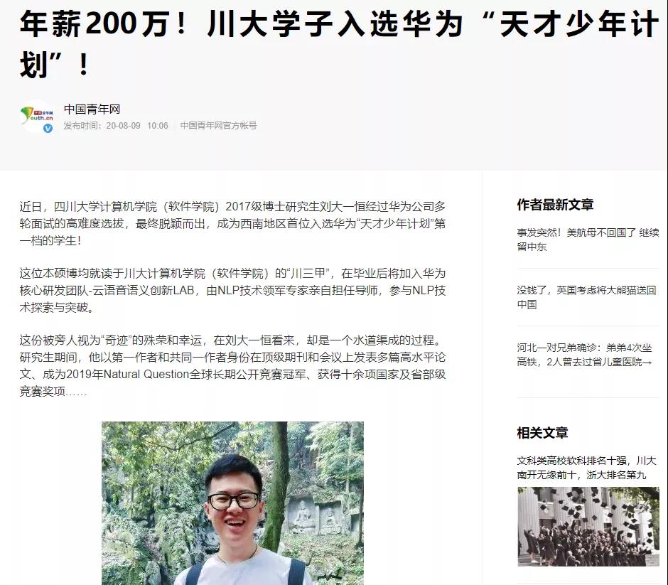 我校计算机学院(软件学院)2017级博士研究生刘大一恒同学通过华为公司“天才少年计划”多轮面试的高难度选拔,最终脱颖而出,成为西南地区首位入选华为“天才少年计划”第一档的学生,全国仅5位学生入选,年薪达到200万元档次。刘大一恒的事迹被中国青年网、封面新闻、红星新闻等媒体报道。