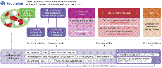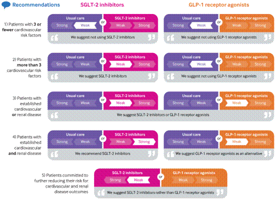 2型糖尿病是在全球造成严重疾病负担的疾病,我国目前已逾1亿患者。该指南从2型糖尿病患者的角度出发,面向全球从事2型糖尿病诊疗的临床医生,在处方两种新型降糖药物SGLT-2抑制剂和GLP-1受体激动剂的选择时进行了循证推荐。指南根据2型糖尿病患者心脏及肾脏并发症风险情况划分为5个分层,即无心血管及肾脏疾病包含3个或更少心血管危险因素、无心血管及肾脏疾病包括3个以上危险因素、已诊断心血管疾病(包括冠心病和卒中)而无慢性肾脏疾病(eGFR<60mL/(min·1.73m2)或尿白蛋白肌酐比≥mg/g)、已诊断慢性肾脏疾病而无心血管疾病、已同时诊断心血管疾病和慢性肾脏疾病。指南附属的系统评价利用最新循证医学证据,定量评估了不同风险分层的患者使用或不使用这两种药物的风险和获益分别进行了评估,最终形成了9条推荐意见。该指南提倡医患共同决策,同时提供了在线交互式医患共同决策工具,供一线临床医生和2型糖尿病患者使用。