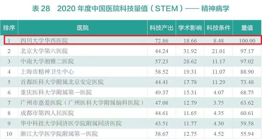 近日,中国医学科学院发布2020年度中国医院科技量值(STEM)综合排名及31个学科排名,此次研究对象覆盖全国1634家三级医院,我校华西医院在2020年度“综合榜”上再度排名第一,已连续蝉联八年。在“学科榜”上,麻醉学、泌尿外科学、精神病学、急诊医学、护理学排名第一,胸外科学、重症医学排名第二,呼吸病学、肾脏病学、内分泌病学与代谢病学、肿瘤学、普通外科学、神经病学排名第三,排名前三的学科由2019年度的9个增加到13个。
