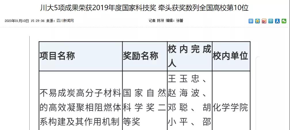 2020年1月10日,2019年度国家科学技术奖励大会上,我校共获得5项国家科技奖,其中,我校牵头获得国家自然科学二等奖2项、国家技术发明二等奖1项。在4月21日公布的2019年度四川省科技进步奖获奖名单里,我校共获四川省科技进步奖27项,其中一等奖14项(牵头11项)。四川新闻网、封面新闻、红星新闻等多家媒体进行了报道。