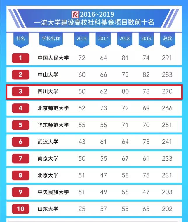 2020年6月,据软科统计报道,2016-2019年中国内地高校获得国家社会科学基金重大项目、重点项目、青年项目、一般项目、后期资助项目、西部项目的资助情况,四川大学以总数270项位居全国第三位。近几年来,我校高度重视繁荣哲学社会科学,出台了《四川大学关于繁荣发展哲学社会科学的若干意见》等一系列学校文件,围绕核心竞争力,推进“文优”发展战略。我校国家社科基金立项数近4年处于国内前列,连续三年年度项目总数位居全国高校第一,其中2018、2019年两年各类国家社科基金总数位居全国第二位。