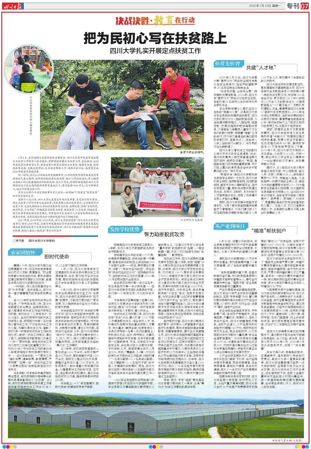 7月13日,四川日报第7版以《把为民初心写在扶贫路上 四川大学扎实开展定点扶贫工作》为题,整版报道了我校积极开展定点帮扶凉山州甘洛县、广安市岳池县的主要思路、有效举措和取得的重要成就。