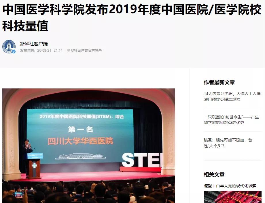 2020年8月21日,新华社客户端、封面新闻等多家媒体报道了2019年度中国医院科技量值(STEM)综合排名及31个学科排名情况。根据报道,在中国医院科技量值综合榜上,华西医院连续七年获第一名。在中国医院科技量值学科榜上,华西医院的麻醉学、护理学、泌尿外科学、急诊医学获得第一;重症医学获得第二;神经病学、精神病学、肿瘤学、胸外科学获得第三。华西口腔医院连续七年蝉联口腔医学第一名。