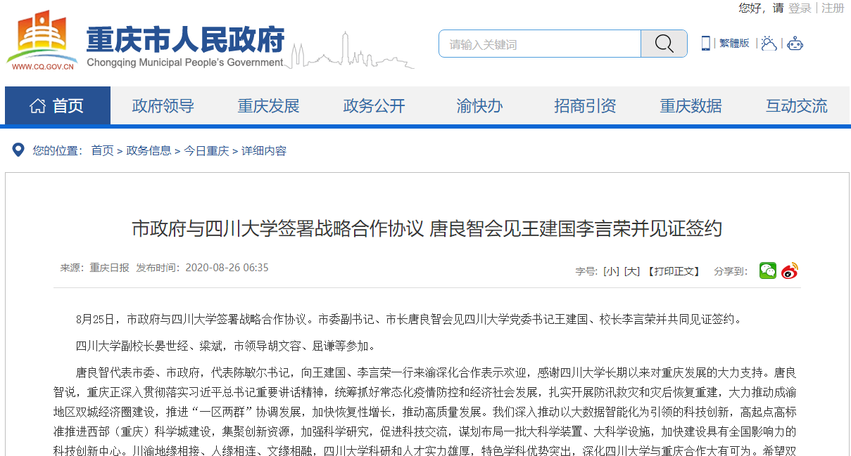 2020年8月25日,我校与重庆市政府签署战略合作协议。按照协议,双方将在开展战略决策咨询、提供智库支持、加强学科建设、推动人才交流与培养、共建市校协同创新载体、支持科研平台建设等方面开展务实合作。作为大学与城市建设的又一典型,重庆日报、凤凰网等多家媒体报道了本次合作。