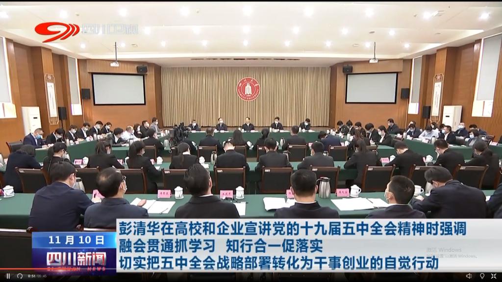 2020年11月2日和6日,学校召开党委常委会和理论学习中心组第六次学习会,认真学习贯彻党的十九届五中全会精神。11月10日下午,中央宣讲团成员、省委书记彭清华来到四川大学,与师生代表面对面交流,向大家宣讲党的十九届五中全会精神。四川日报、四川新闻网等媒体对此进行了报道。11月17日,学校在望江校区明德楼举行党的十九届五中全会精神宣讲报告会。校党委书记王建国为学校广大干部师生作宣讲报告。校长李言荣主持报告会。