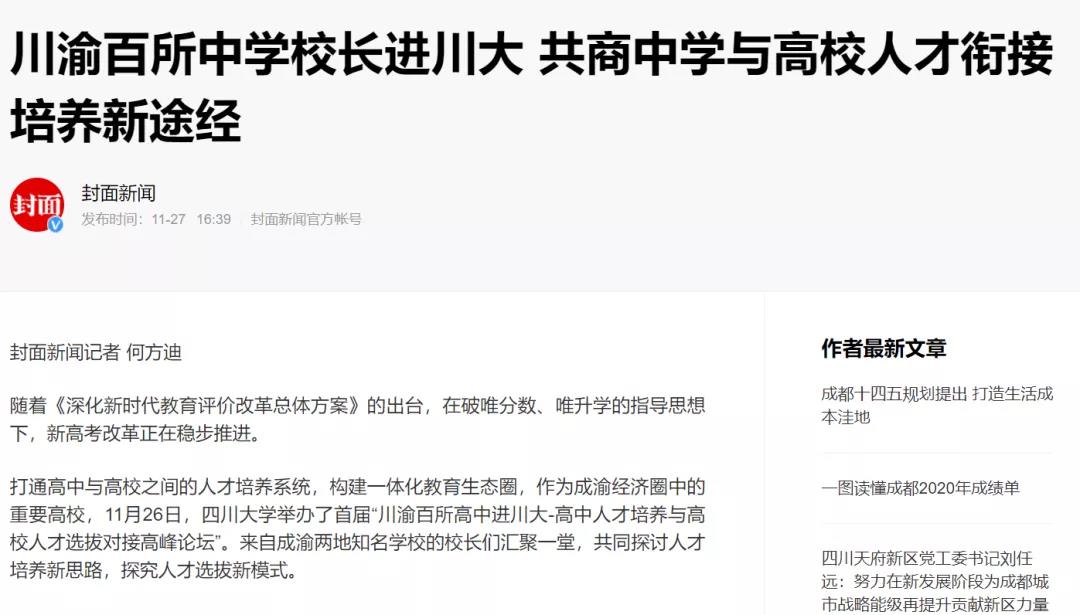 2020年11月27日,川渝百所高中进川大——高中人才培养与高校人才选拔对接高峰论坛在学校国际学术交流中心举行。论坛期间,百所高中的校长还走进川大校园,深入了解川大校史,参观川大各博物馆和国家级实验室、走进智慧教室,切实感受新时代川大的优质教育教学环境。这一探讨高中与高校在人才培养及人才选拔方式上的有效衔接的交流活动被封面新闻等多家媒体报道。