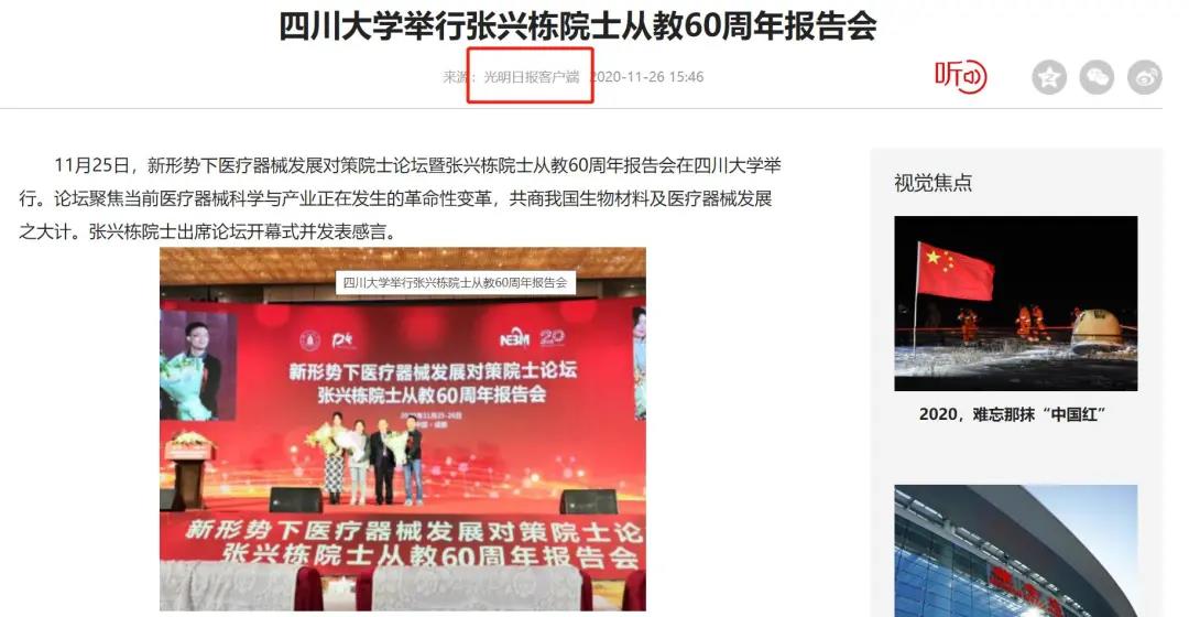 2020年11月25日,新华网、光明日报客户端等媒体报道了我校召开的新形势下医疗器械发展对策院士论坛暨张兴栋院士从教60周年报告会。被誉为“生物材料研究的世界引导者”、中国工程院院士张兴栋,及政府有关部门领导、中外院士和知名专家学者、业界精英共500余人参加大会。会上举行了四川大学生物医学工程学院揭牌仪式、四川大学双聘院士与特聘教授聘任仪式、四川大学APEC监管科学卓越中心揭牌仪式。《四川日报》对张院士做了整版报道。