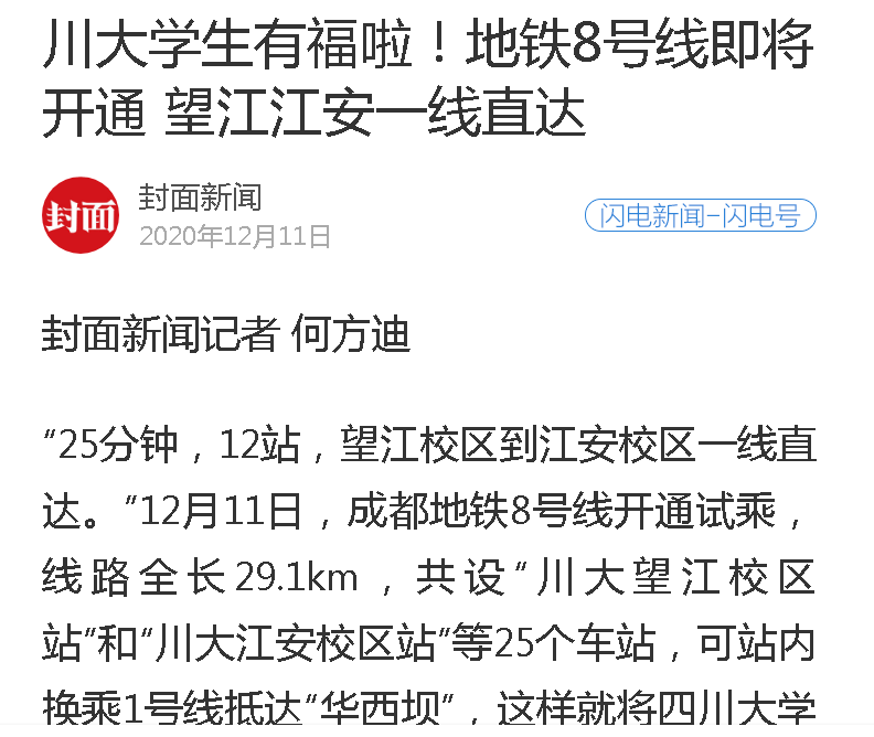 据封面新闻、红星新闻等媒体报道,12月11日,成都地铁8号线开通试乘,线路全长29.1km,共设“川大望江校区站”和“川大江安校区站”等25个车站,可站内换乘1号线抵达“华西坝”,这样就将我校望江、江安和华西校区有机串联,在很大程度上方便了学校师生出行。