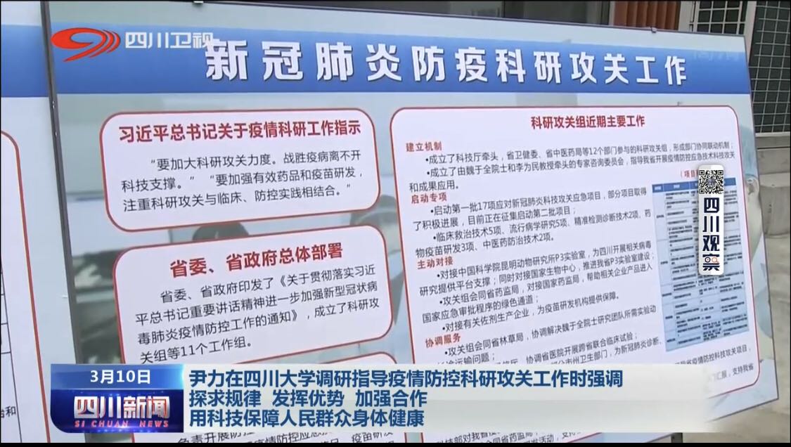2020年2月,四川大学华西医院生物治疗国家重点实验室研发的新冠病毒重组蛋白疫苗开展动物实验。3月10日,尹力省长到我校调研指导疫情防控科研攻关工作。7月29日,四川大学新冠病毒重组蛋白疫苗相关研究成果在Nature 在线发表,这是Nature杂志发表的第一篇新冠疫苗研究论文。8月21日,该重组蛋白新冠疫苗获国家药监局临床试验批文。