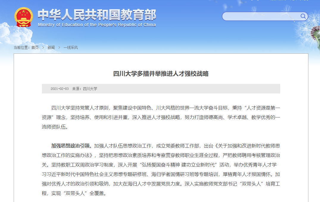 编者按:日前,教育部网站“一线风采”栏目以《四川大学多措并举推进人才强校战略》为题,对我校秉持“人才资源是第一资源”理念,持续推进人才强校战略,深化人事制度改革,大力加强一流师资队伍建设的举措和成效作了专题报道,全文如下: